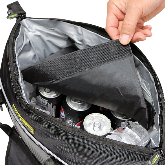 Caracteristicas: Zippered cooler holds up to 12 cans and ice Removable waterproof liner Measures 12" L x 7" W  x 14" D Adjustable securing panel and 4-point tie-down system with quick release keeps cooler firmly in place