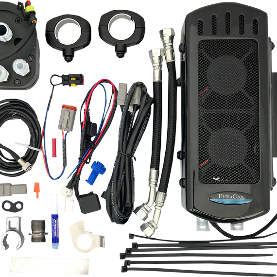 Caracteristicas: Oil Adapter and Thermal Switch with waterproof connectors automatically turns on the powerful dual fans when oil reaches 210 degrees Specially designed aluminum heat exchanger with turbulators for maximum heat dissipation Sealed Waterproof IP68 Dual Fans producing 220 CFM of airflow Plug and play wiring harness with relay and waterproof connectors that all connects to the battery under the seat for simple installation Black nylon coated stainless steel braided oil lines with AN6 fittings L.E.D. indicator light indicates when the fans are operating Special designed Oil Line Fitting Wrench and detailed instructions included