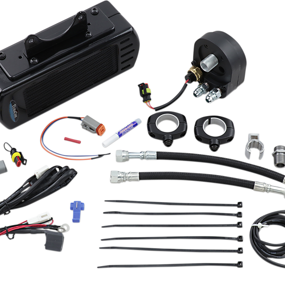 Caracteristicas: Oil Adapter and Thermal Switch with waterproof connectors automatically turns on the powerful dual fans when oil reaches 210 degrees Specially designed aluminum heat exchanger with turbulators for maximum heat dissipation Sealed Waterproof IP68 Dual Fans producing 220 CFM of airflow Plug and play wiring harness with relay and waterproof connectors that all connects to the battery under the seat for simple installation Black nylon coated stainless steel braided oil lines with AN6 fittings L.E.D. indicator light indicates when the fans are operating Special designed Oil Line Fitting Wrench and detailed instructions included