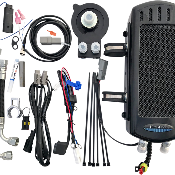 Caracteristicas: Oil Adapter and Thermal Switch with waterproof connectors automatically turns on the powerful dual fans when oil reaches 210 degrees Specially designed aluminum heat exchanger with turbulators for maximum heat dissipation Sealed Waterproof IP68 Dual Fans producing 220 CFM of airflow Plug and play wiring harness with relay and waterproof connectors that all connects to the battery under the seat for simple installation Black nylon coated stainless steel braided oil lines with AN6 fittings L.E.D. indicator light indicates when the fans are operating Special designed Oil Line Fitting Wrench and detailed instructions included