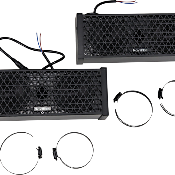 Caracteristicas: Two 31/2” full-range aluminum speakers and a 1/2” horn tweeter per bar Locking tabs allow for attaching both single boxes into one sound bar 100W RMS power rating (per speaker) Include bar mounting clamps Measure 4.2” H x 10.9” W x 3 D