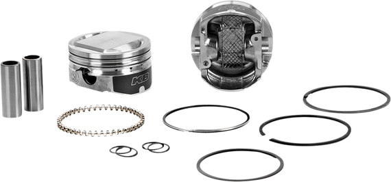 Caracteristicas: Manufactured from high-strength, T-5 heat-treated, 390 hypereutectic aluminum alloy Allows a tighter fit and longer piston and ring life Diamond-machined pistons are held to plus or minus one gram weight and less than one-half-thousandth-inch (.0005") tolerances from piston to piston Each kit contains two pistons, pins, spiral-lock pin clips and Hastings moly rings Replacement piston rings sold separately KB pistons can be installed tighter than other pistons. This results in less piston rock and better ring seal. Please read instructions included with piston for correct piston clearance Due to the thermal conductivity and design of KB pistons, special attention is required to the top ring end gap. Please read instructions furnished with piston for correct ring installation Use lock rings Part #0913-0001 (4-pk)