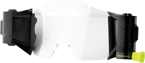 Caracteristicas: Built with 45 mm wide field of vision Self-cleaning canister with integrated film wipe reduces mud build up Smooth rolling drawstring for easy pulling Anti-fog coated polycarbonate lens with anti-stick dots 9 retention points secure lens in frame In the box: mud flap, 2 rolls of film and microfiber bag