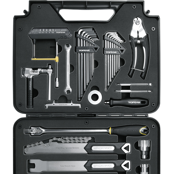 Caracteristicas: The chain tool is compatible with single and multi-speed chains up to 12 speed, including Campagnolo® 11 speed hollow pin chains Great for shop work or at-home bike maintenance Attachable carry bag for additional tools Contains 36 professional shop quality bike tools including: T7, T9, T10, T15, T20, T25, T27, T30 Torx® wrenches and a T25 Torx® bit 1.5 mm, 2 mm, 2.5 mm, 3 mm, 4 mm, 5 mm, 6 mm, 8 mm hex wrenches 4 screw drivers (4 mm and 6 mm flat head, and #1 and #2 Phillips head) 13G, 14G, 15G, and Shimano® 4.3 mm spoke wrenches 3 mm, 4 mm, 5 mm, 6 mm Allen bits 8 mm and 10 mm open wrenches Chain wear indicator chain tool Chain hook Measures 15.9” L x 12.6” W x 4.5” H Weighs 10.21 lb.