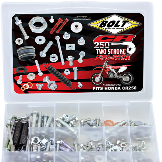 Caracteristicas: Includes complete fasteners and bushings for all bodywork, all outer case bolts, all cylinder and head fasteners, all swingarm hardware, triple clamp hardware, brake hardware, sprocket bolts, rotor bolts, rear axle nut, pipe springs, pipe silencer seal, drain plug washers, and Bolt's exclusive thread chasers. All outer engine, chassis, and wheel hardware in factory style and finish for a complete CR125 and CR250 overhaul.