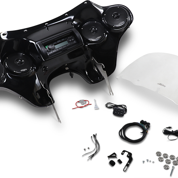 Caracteristicas: Classically styled fairing that delivers the ultimate in sound and wind protection Top-quality hand-laid fiberglass construction, gloss black gel-coated Include Jensen JHD3630BT head unit; features AM/FM/CD/USB SiriusXM capable and iPod Ready stereo with Bluetooth Stereo comes completely assembled with marine-grade weather door and four 5" pre-wired speakers Handlebar control is die cast aluminum and waterproof with rubberized buttons Concealed internal antenna for a clean, uncluttered look Easy quick-detach connection to bike's electrical system Kit includes quick-release brackets to mount on OEM windshield docking points or accessory detachable windshield docking points Includes a 12" clear windshield, will accept 96-13 FLHT OEM style and aftermarket replacement windshields (sold separately) (some drilling and trimming may be required) Made in the U.S.A. Fairings with handlebar control do not come with CD player.