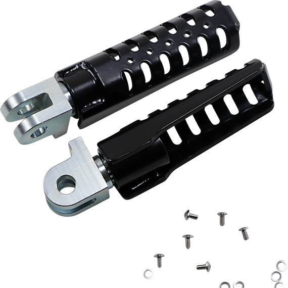 Caracteristicas: Powder-coated steel pegs offer good lean angle with their slash style bottom edge Traction screws line the top surface for added grip Screws can be installed with the provided split lock washers, or give them an even more aggressive bite by removing the lock washers and installing the screws with heavy-duty Loctite®? for more exposed screw through the top Fit most H-D clevis mounts