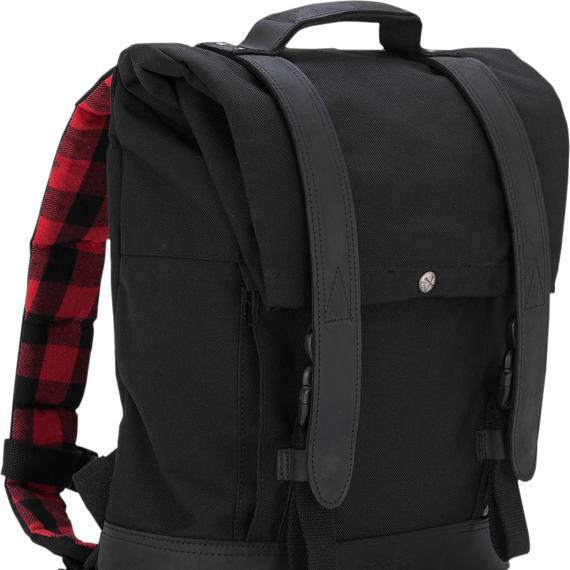 Caracteristicas: Wet-waxed UV-treated cotton canvas construction Leather paneling for style and support Burly brand flannel straps Interior is fully padded with a partition for a 15" laptop Auxiliary pass-through port for charging cables or audio cords Large front zippered pocket for storing loose items Roll top has variable-height snap closure Speed buckles, zippers and metal Burly-embossed button snaps and accents Anti-flail snap system keeps everything in place at speed