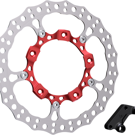 Caracteristicas: 14” Big Brake rotor kits with a CNC machined billet inner carrier Each kit drastically improves braking performance, upgrades the style, and provides an anodized color accent to your factory front wheel Each 14” full floating rotor is constructed from 420 stainless steel outer disc that is drilled for optimum performance and a 6061-billet inner carrier Billet brake caliper adapters are included in each kit to properly relocate your factory caliper to the proper position Utilizes factory brake caliper, rotor hardware and brake hose. Easy bolt-on installation, no need to re-bleed the brake system Designed to fit HD FLT Touring models with factory wheels equipped with spoke mounted rotors Each kit includes 14” rotor, caliper adapter bracket and all necessary hardware
