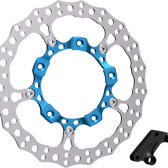 Caracteristicas: 14” Big Brake rotor kits with a CNC machined billet inner carrier Each kit drastically improves braking performance, upgrades the style, and provides an anodized color accent to your factory front wheel Each 14” full floating rotor is constructed from 420 stainless steel outer disc that is drilled for optimum performance and a 6061-billet inner carrier Billet brake caliper adapters are included in each kit to properly relocate your factory caliper to the proper position Utilizes factory brake caliper, rotor hardware and brake hose. Easy bolt-on installation, no need to re-bleed the brake system Designed to fit HD FLT Touring models with factory wheels equipped with spoke mounted rotors Each kit includes 14” rotor, caliper adapter bracket and all necessary hardware