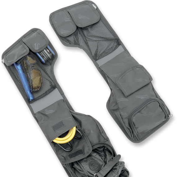 Caracteristicas: Trim, functional and smartly styled organizers fit snugly into the lids of FLD-style hard saddlebags Organize your trip packing and maximize your cargo space using the organizer's various closed and mesh see-through storage pockets A variety of elastic bands keep your flashlight, tire gauge and other gear in place, but easily accessible Includes right and left organizer Easily installs to the saddlebag lids with included hook-and-loop fastener strips at the factory hardware points Installation can be completed in minutes with no modification to your motorcycle's luggage Rugged construction will last a lifetime with its 600-denier and 150-denier polyester materials Measures: 20" x 65/8" x 1/2"