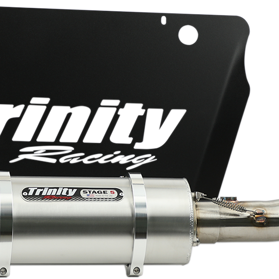 Caracteristicas: Single exit exhaust system that provides significant horsepower and torque gains 304 stainless steel header pipe with 14" aluminum muffler 2.5" baffle for improved exhaust flow 6061 Billet Muffler Clamps and Machined Exhaust Tip Includes oxygen sensor bung, quiet core, and laser-cut Trinity back plate USFS approved spark arrestors Fully Tig Welded Made in the USA