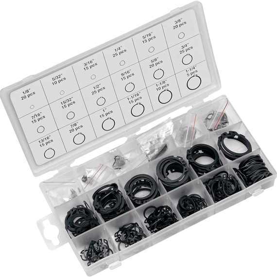 Caracteristicas: Contains 300 assorted snap rings in 16 sizes ranging from 1/8" to 1-1/4" Convenient, resealable plastic case