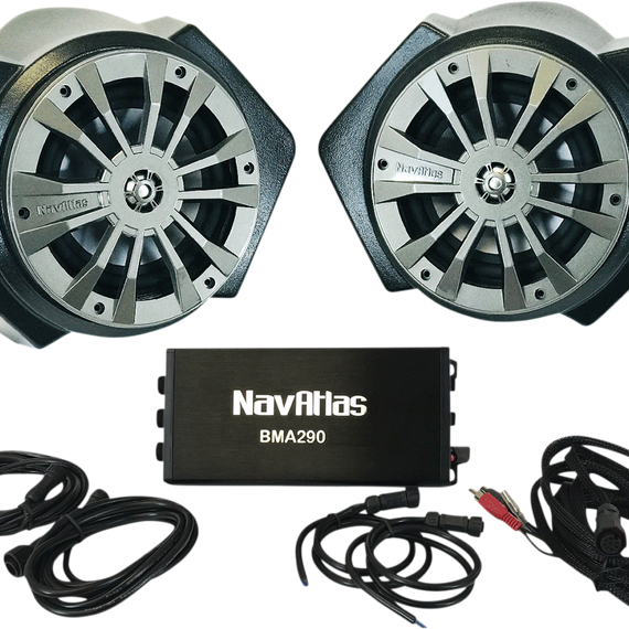 Caracteristicas: 6.5" Navatlas Marine Rated speakers come in tough Composite enclosures designed to perfectly fit into the kick plate The IP66 rated 350W full-range amplifier is capable of running 4 speakers Cable and installation parts included