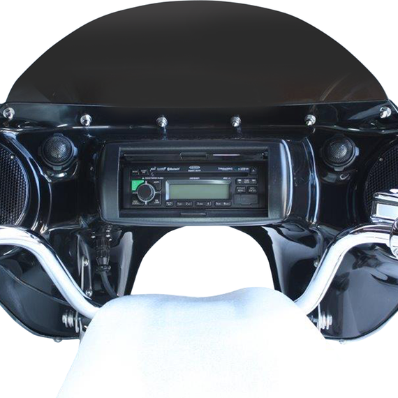 Caracteristicas: Sleeker and more compact version of Hoppe Industries' original Quadzilla stereo fairing; 5" narrower and 4" shorter without losing sound quality Top-quality, hand-laid fiberglass construction, gloss black gel-coated Includes Jensen JHD3630BT head unit; features AM/FM/CD/USB SiriusXM capable and iPod® ready stereo with Bluetooth Handlebar control is die cast aluminum and waterproof with rubberized buttons Stereo comes completely assembled with marine-grade weather door, two 6" speakers and two ultra-high-end JBL 1" tweeters Internal antenna keeps the lines smooth Easy quick-detach connection to bike's electrical system Kit includes quick-release brackets to mount on OEM windshield docking points or accessory detachable windshield docking points Includes a 6" dark tint windshield, will accept 96-13 FLHT OEM style and aftermarket replacement windshields (sold separately) (some drilling and trimming may be required) Made in the U.S.A. Fairings with handlebar control do not come with CD player.