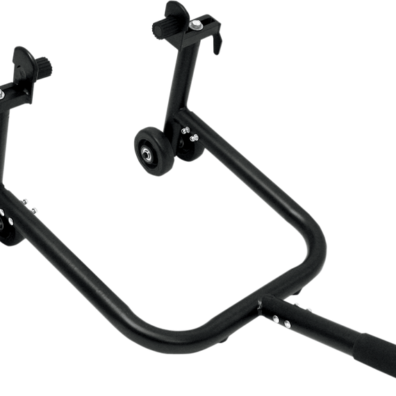 Caracteristicas: Designed to fit most sportbikes with standard dual-arm swingarms Stand width is adjustable from 8-3/4" to 13-3/4" Wide frame design allows stand to lift rear of sport bike with or without spools incorporated; simply unbolt and flip hardware over to desired setting (spools or rubber paddles) Four durable 4" wheels with precision bearings create a smooth transition while lifting rear of bike Rubber-coated handle for grip and comfort