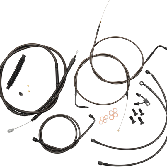 Caracteristicas: Standard kits include clutch line, brake lines, black "T" brake line junction, banjo bolts, fittings and copper crush washers Standard kits include the correct length brake/clutch lines and wire extensions to complete a handlebar swap Electrical wire extensions NOT included (available separately) Midnight series kits include clutch line and brake lines covered in a black smoke tinted coating with pure black fittings throughout Lines appear graphite or carbon fiber in appearance providing that ultra custom look and the black fittings seamlessly blend with blacked out controls and covers on the bike Made in the U.S.A. Kits are based on using 2" risers with Ape Hanger handlebars