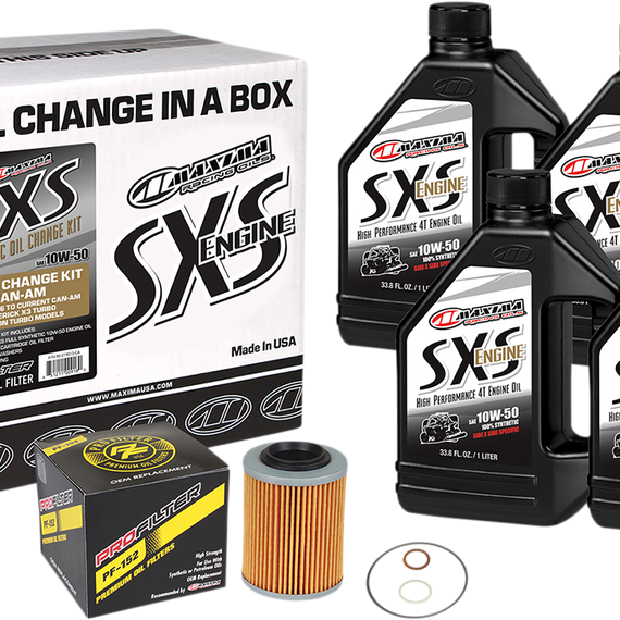 Caracteristicas: Includes Maxima SxS Full Synthetic Engine Oil to complete an engine oil change on your SXS 1 ProFilter Oil Filter with wrench removal nut 1 Drain plug crush washer/o-ring Reduces friction & engine temperatures Superior protection and oxidative stability at any temperature Surface-active chemistry aggressively attaches to engine surfaces and keeps them clean