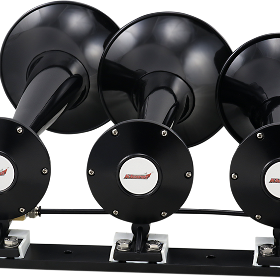 Caracteristicas: Three trumpets, 17.5", 15.5" and 11.5" Deep, loud train horn sound Detachable black ABS trumpets Vortex 6 12v electronic all brass high flow train horn solenoid included 153.3* db output