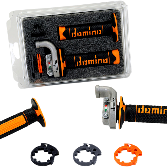 Caracteristicas: Adjusts the throttle to adapt to changing conditions Includes throttle housing, throttle tube with pulleys, grips and inner housing cable router Fits up to stock cables and is supplied with three interchangeable pulley rings to adjust control Gray pulley is similar to stock ratio, 38 mm diameter Orange pulley is approximately 10% quicker than stock, 42 mm diameter Black pulley is approximately 15% quicker than stock, 44 mm diameter Includes black/orange Diamante grips