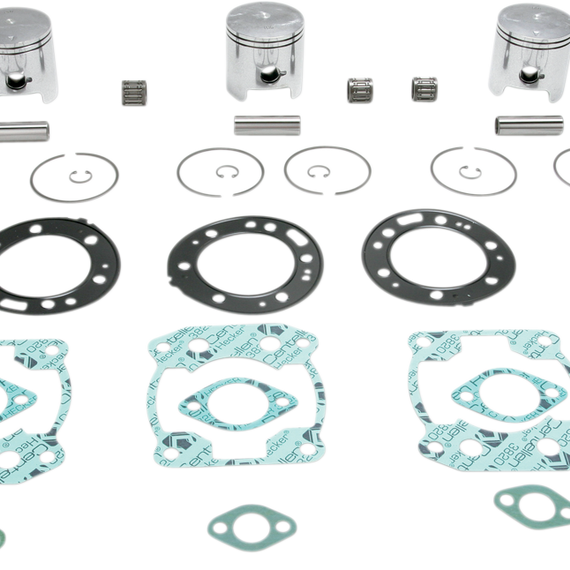 • Include pistons, rings, pins, clips, racing needle bearings, head and base gaskets, intake and exhaust gaskets