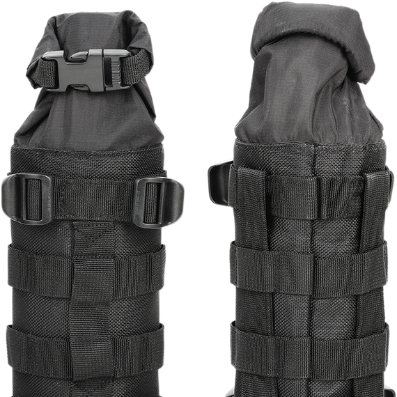 Caracteristicas: UltraMax® fabric for UV protection Rolltop closure ensures bottle stays secure Integrated straps weave into MOLLE systems as found on Trails End tail bags Four webbing straps and buckles can mount to most racks Able to hold up to 30 oz bottles 12”H rolled with 30 ounce bottle 3.75” diameter