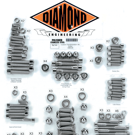 Caracteristicas: Customize a bike without having to completely disassemble it Groups of polished stainless steel fasteners covering the engine, transmission and the most visible areas of the motorcycle Kits add detail and a custom look with ease Kits include fasteners for primary, inspections and inner primary; cam and points; oil pump or oil line cover, filter mount and sensors (Dyna and Twin Cam FLHT) or oil filter plugs and sensors (Softail Twin Cam); lifter blocks; rocker box; coil and circuit breaker covers (Dyna); transmission side cover; oil filler (FLHT models); transmission top cover; handlebar clamp, switch housings and master cylinder; front fender or front fender trim and fuel tank (FLHT models); rear fender rail or swingarm pivot blocks and rear floorboard brackets (FLHT models) Made in the U.S.A.