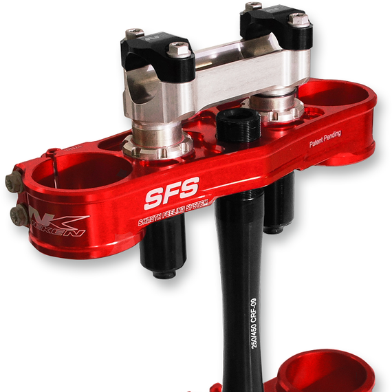 Caracteristicas: CNC machined from aerospace quality Tridium alloy Handlebar clamp included Easy to install; pre-pressed Pivot Works lower bearing included The industry's first air-adjustable, oil-damped suspended handlebar clamp, offering 10mm of travel Improve the riding comfort and decrease arm pump Developed in collaboration with top US MX/SX and MXGP teams No service required Torque settings etched on clamps Patented in Europe and USA High-pressure air pump required to adjust the clamps