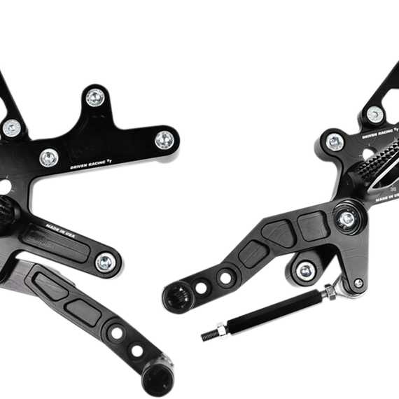Caracteristicas: Race-inspired design All rearsets feature high-grade hardware, folding shift/brake pegs and standard or reverse shift pattern options Footpeg plate has a small window that shows peg adjustment value and conceals all mounting holes not in use Anodized black finish