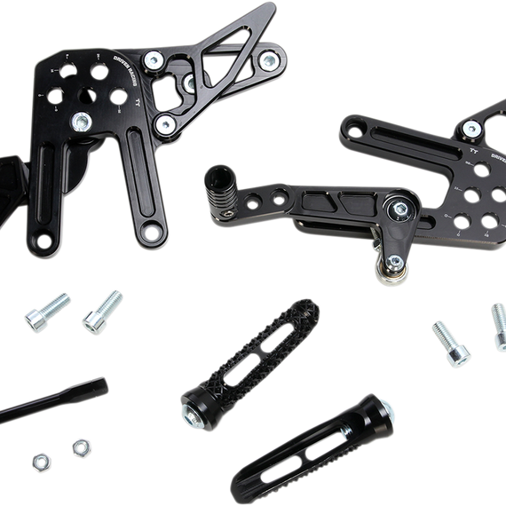 Caracteristicas: Race-inspired design All rearsets feature high-grade hardware, folding shift/brake pegs and standard or reverse shift pattern options Footpeg plate has a small window that shows peg adjustment value and conceals all mounting holes not in use Anodized black finish
