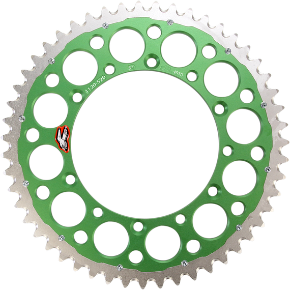 Caracteristicas: Inner ring is the same high strength Ultralight™ 7075 T-6 aluminum used for the standard Renthal sprocket Outer ring is electro-less nickel coated steel for ultimate durability and is designed with the minimum amount of material to keep weight down The outer ring is expanded at 200°C and then fitted over the inner; this interference fit combined with the wave pattern ensures a permanent bond for the life of the chainwheel The flat socket head screws add additional strength to the chainwheel during side impacts and eliminates contact with the chain guide Self cleaning mud grooves between each tooth prevent dirt build upand reduce chainwheel wear and weight Will outlast a standard all aluminum sprocket by 3 times, yet is much lighter than an all steel rear sprocket