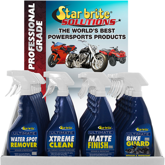 • Each display comes loaded with six 22-ounce spray bottles of Ultimate Xtreme Clean, Ultimate Bike Guard, Ultimate Water Spot Remover, and Ultimate Matte Finish