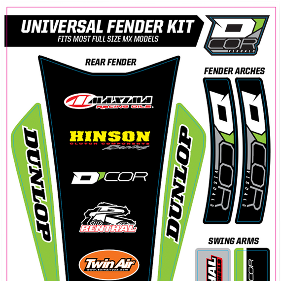 Caracteristicas: Fits most MX full size models Includes graphics for front fender, rear fender, fender arches and swingarm 15 mil decal thickness