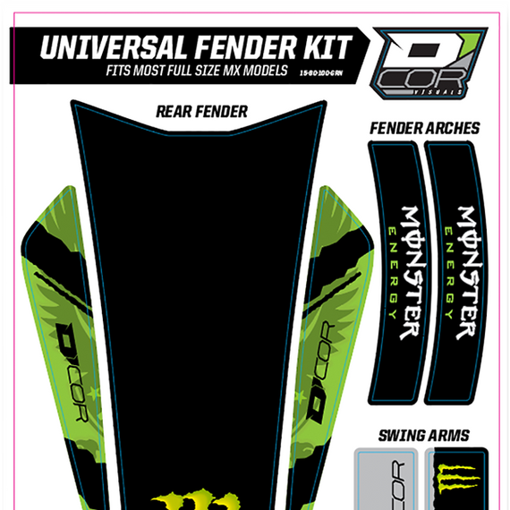 Caracteristicas: Fits most MX full size models Includes graphics for front fender, rear fender, fender arches and swingarm 15 mil decal thickness