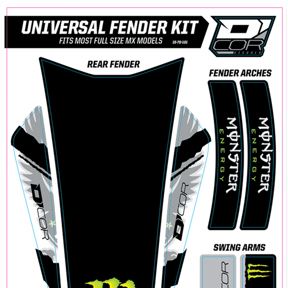 Caracteristicas: Fits most MX full size models Includes graphics for front fender, rear fender, fender arches and swingarm 15 mil decal thickness