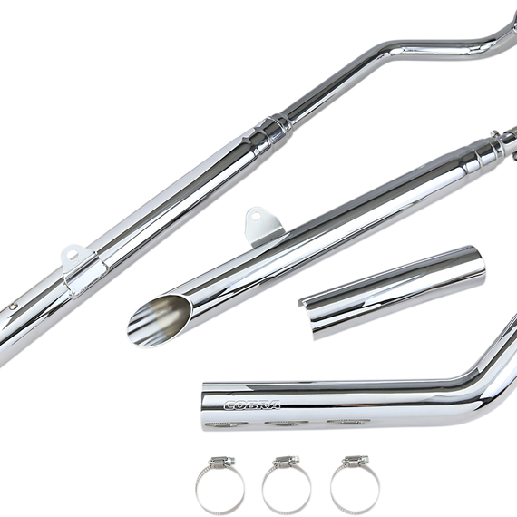 Caracteristicas: Nothing is simpler than a drag pipe. What's not to understand? The straightest possible pipe, the fewest possible bends, the least possible backpressure Pure drag pipes work great on dragsters because they spend 100 percent of their time at full throttle. In the real world, you need a little added finesse -- the Cobra touch Cobra's drag pipes have the pure, simple lines riders want, and they come with their removable power cores With the cores in you get a great, sharp bark of an exhaust note that's still appropriate for riding in town. And you'll also get a real performance increase you can feel Uses stock front headers