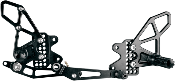 Caracteristicas: CNC-machined from solid billet aluminum; lighter and stronger Version 2 has a new adjustment design that allows for more footpeg and toe peg positions Race grip footpegs offer traction for the most rigorous riding Dual-roller bearings in each lever allow for ultra precise shifting and braking Anodized black finish Made in the U.S.A. Footpegs remove from the front for quick replacement 3D-machined heel guards