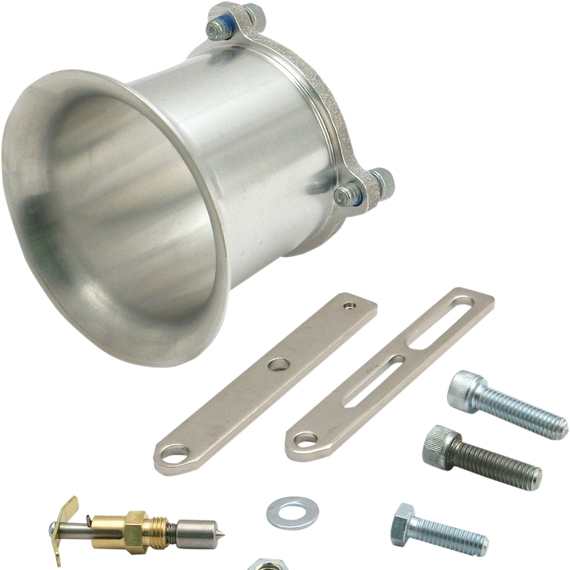 Caracteristicas: Kit includes: air horn, three mounting screws, carb support bracket (bracket connects the center crankcase bolt to the bottom manifold carburetor mounting bolt), two longer bottom carb-to-manifold mounting bolts and an enrichment device Fully machined from lightweight alloy aluminum castings Fits Super E & G carbs