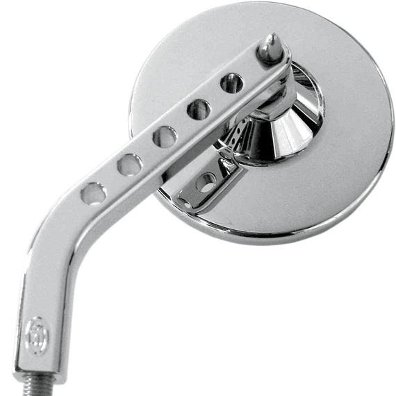 Caracteristicas: Fully adjustable 3-1/4" diameter mirror heads have ultra-exceptional rear visibility due to the use of custom-made convex mirror glass Retro style "holes" along the stem for lightness Completely CNC machined from billet aluminum (not cast), lightweight, and strong Swivel mirror head assembly is completely serviceable and is machined from a stainless-steel alloy ball that rides in a special polymer base to ensure super smooth action and corrosion free operation Direct bolt-on fit for 1984 - 2020 Harley hand controls (including V-Rod) and most aftermarket hand controls Mounting hardware is included Made in the U.S.A.