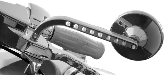 Caracteristicas: Fully adjustable 3-1/4" diameter mirror heads have ultra-exceptional rear visibility due to the use of custom-made convex mirror glass Retro style "holes" along the stem for lightness Completely CNC machined from billet aluminum (not cast), lightweight, and strong Swivel mirror head assembly is completely serviceable and is machined from a stainless-steel alloy ball that rides in a special polymer base to ensure super smooth action and corrosion free operation Direct bolt-on fit for 1984 - 2020 Harley hand controls (including V-Rod) and most aftermarket hand controls Mounting hardware is included Made in the U.S.A.