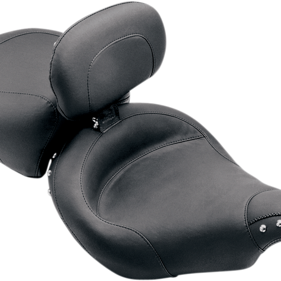 Caracteristicas: Solo seat is trimmed with a functional skirt that comes down over the frame and fender for a clean, uninterrupted look Steel base with support wings holds up the full width of the foam bucket Matching rear seat features a recess in the front of pad to accommodate the backrest (sold separately) Backrest has four height adjustments from 13.5" to 15.5" above seat bucket, and measures 7" high by 12" wide Backrest is easily removed and installed without tools; folds forward for easy mounting of bike Made in the U.S.A.