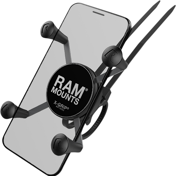 Caracteristicas: Made of stainless steel components and high-strength composite for durability and reliability in the most demanding environments Spring-loaded 'X' design with rubber caps sports great holding power without hiding your phone; includes optional device tether for peace of mind during rugged use RAM® X-Grip® is connected to the RAM® EZ-On/Off™ bicycle base, featuring zip ties for attachment to a variety of handlebar diameters RAM® X-Grip® fits phones ranging from 1.87" to 3.25" in width and keeps your device completely functional and accessible Adjust the zip ties for attachment to a variety of rails, from a minimum of .5" in diameter