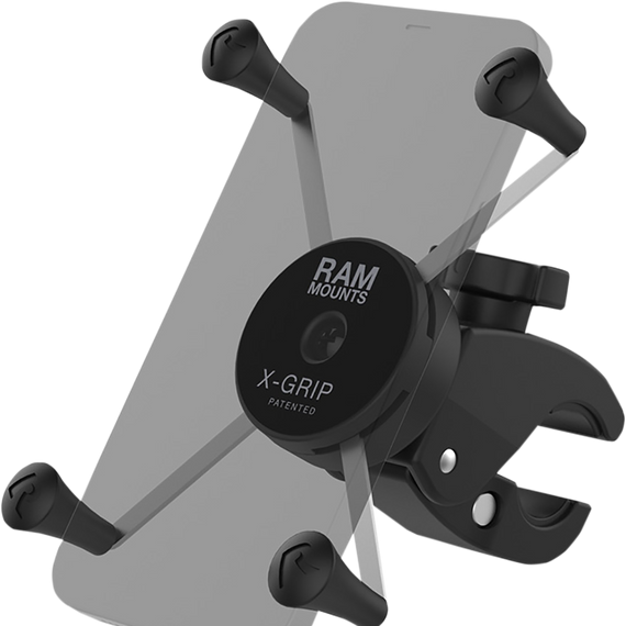 Caracteristicas: Low-profile phone mount clamps to your handlebar with the turn of a single knob Spring-loaded 'X' design for standard size phones with rubber caps sports great holding power without hiding your phone; includes optional device tether for peace of mind during rugged use Small version of the RAM® Tough-Claw™ base is designed to quickly clamp to round, square, and odd-shaped rails and bars ranging from 5/8" to 1-1/2" in diameter; rubber pads provide stable gripping and protection of mounting surface Made of high-strength composite and stainless steel hardware for durability and reliability in the most demanding environments Backed by a lifetime warranty