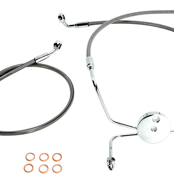 Caracteristicas: Manufactured with an enhanced construction for extreme braking response and durability Designed to be compatible with Harley-Davidson® ABS requirements for stock and alternate length brake lines Inner PTFE tubing braided with XR Stainless Steel reinforcement embedded in a tough Nylon outer jacket offers exceptional protection for paint or chrome All fittings are highly polished and chrome plated All brazed manifold construction eliminates leaks, alignment problems, and unattractive threaded connections for a sleek appearance -3AN connections for easy installations Assembled in the U.S.A. Complete kits contain brake line assemblies to connect the caliper(s) to the master cylinder All non-ABS kits are complete kits Dyna and Sportster ABS kits are complete and include an upper and lower brake line Touring, Trike and Softail ABS brake line kits are available separately as upper and lower kits (except 2018+ Softail FXFB which is a complete kit) ABS lower kits are optional and do not require an upper line for installation ABS upper kits contain a brake line assembly with any needed adapters to connect the ABS controller or lower brake line assembly to the master cylinder. A lower brake line assembly is not required