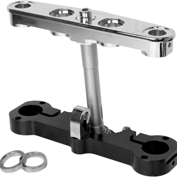 Caracteristicas: The KO "Kick Out" Triple Tree Kits allow the use of 23" and 26" wheels on Softail models without modifying factory frame Provides proper rake and trail for great handling Trail numbers depending on front wheel size CNC machined from billet aluminum Each kit includes billet aluminum triple trees, steering stem, fork tube extension, fork stops, travel limiters and all necessary hardware Softail models feature chrome top triple tree and accepts factory or Ness fork boots and fork legs Will not work with factory diameter wheels. Raked triple trees change the handling characteristics of the motorcycle. Use caution until familiar with the changes.
