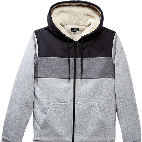 • Hooded fleece body with color blocking and poly overlay yoke and hood