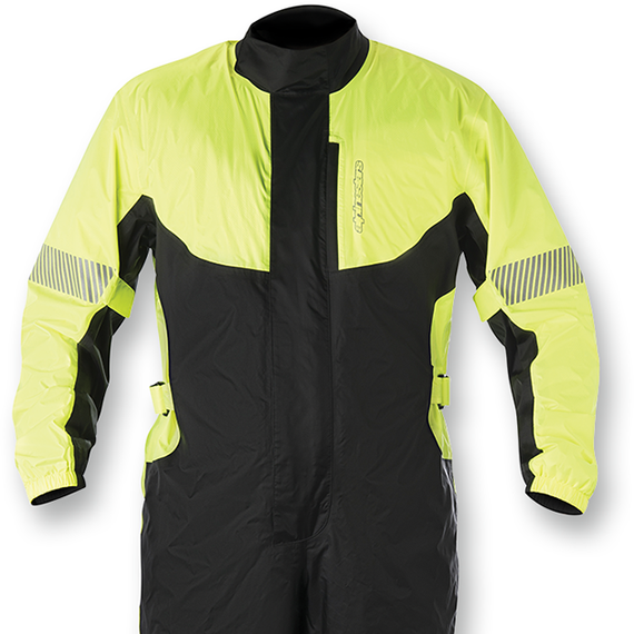 Caracteristicas: Constructed from ultra-lightweight Polyurethane (PU) coated 100% waterproof poly-nylon fabric that has been specially treated to avoid sticking when worn over leather or textile garments Black fluorescent colorway incorporates poly-textile panels for color fastness All seams are tape-sealed for 100% waterproofing performance Light poly-mesh lining improves air circulation for comfort Twin slider main zipper closure runs from the thigh to the chest to allow for easy in/out of the suit Reflective detailing improves rider visibility in poor weather conditions Hook-and-loop adjustments on arms ensures a close fit Elasticized collar, cuffs and lower leg hems help to form a hermetic seal to keep out wind and water Waterproof storage compartment on the inside of the chest for secure storage and easy access Zippered lower leg gussets helps the pants fit closely around riding boots Includes storage/transport bag so it can be easily carried