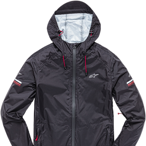 Caracteristicas: Hard-shell rain jacket with water resistant 2.5L fabric and taped seams. 100% Nylon. Fixed hood, pre-curved arms, coated reverse coil front zipper, zipper hand pockets. Underarm zipper vents, bungie adjusters at hood and hem, hook and loop adjuster tabs at cuffs, reflective details. Internal main label and external label branding. Logo at chest.