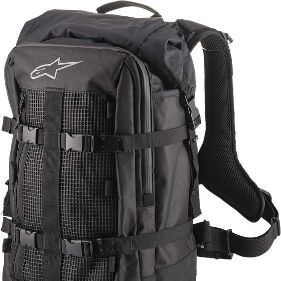 Caracteristicas: 32.4-litre capacity adventure touring backpack with ergonomic design for rider comfort Clever compression design means that if the front compartment is empty, it will flatten with the compression straps to lay flat against the main compartment Large and tall roll top main compartment for quick and easy access, with a removable waterproof liner Equipped with multiple external pockets for quick access to contents Expandable side pods with zippers for extra capacity Front large zipper pocket, side entry front panel pocket and small items pocket on the lid for storage of essential items Hydration pocket for rider comfort All straps are finished with easy pull ends for ease of use, with tie down loops for added security.