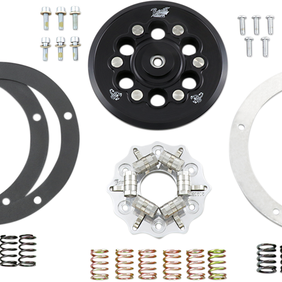 Caracteristicas: Specifically designed to fit under the stock or aftermarket primary/derby covers and increase the capacity of your stock clutch by using stainless steel weighted arms that progressively increase pressure to the clutch as rpm increases This also allows lever effort to be kept to a minimum - even with big-inch motors Three different sets of six coil springs (light, medium, heavy) are included for a variety of spring pressure options Coil spring design provides much smoother shifting and a more progressive, linear engagement compared to a diaphragm-type spring Simple bolt-on installation is all that is required with no modifications needed Made in the U.S.A.